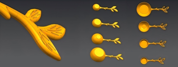 Först involverade vi att bedöma produktens form och potentiella användning baserat på tidigare erfarenhet. Med zinklegering som primärt material beräknade vi materialdensitet och ytegenskaper, inkorporerade ergonomi och designade de övergripande måtten för de fyra mätskedarna eller isskedarna. Därefter förfinade vi varje kurva, R-radies-skaladetaljer och andra små dimensionsvinklar.