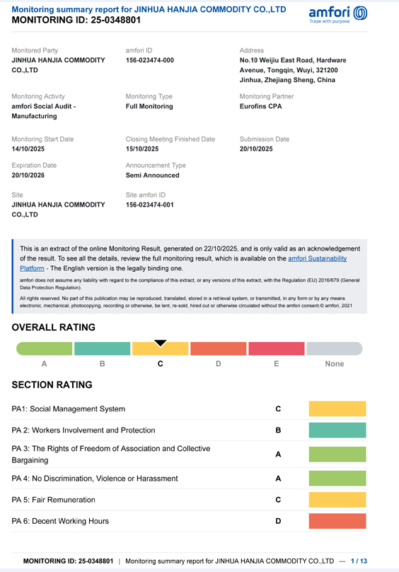 Jinhua Hanjia commodity Co., Ltd. har släppt resultaten av sin BSCI-revision. Den 14 oktober klarade företaget framgångsrikt den professionella utvärderingen och erhöll en klass C-certifiering, som uppfyller de minimikrav som specificerats av kunden. Giltighetsperioden för denna certifiering är ett år. BSCI-revisionen genomfördes av EUROFINS-inköpsföretaget och tillbehören av denna kund. rostfria stålprodukter såsom cocktailshaker från vårt företag under lång tid. Kundens land kräver att leverantörer har denna certifiering.