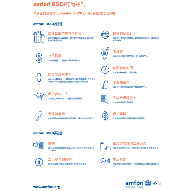 I enlighet med kraven i BSCI-reglerna kommer vårt företag att strikt följa arbetsriktlinjerna som beskrivs i Amfori BSCI:s uppförandekod för att säkerställa ett effektivt genomförande av BSCI-principerna. Under produktionsprocessen respekterar vi arbetarnas rätt att bilda fackföreningar på ett fritt och demokratiskt sätt och att delta i kollektiva förhandlingar för att undvika att arbetstagare får arbete och att barn inte diskrimineras. arbetspraxis och ersättning. Dessutom garanterar vi att arbetare har anständiga arbetstider och andra grundläggande rättigheter.
